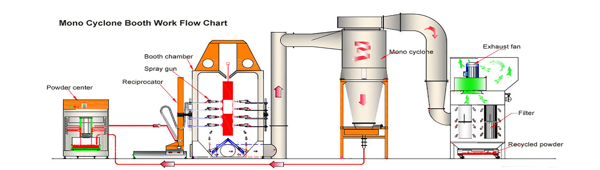 The powder coating is sent from the powder supply bucket to the spray gun through the powder conveying pipe, and after being charged, it is uniformly adsorbed on the surface of the workpiece.